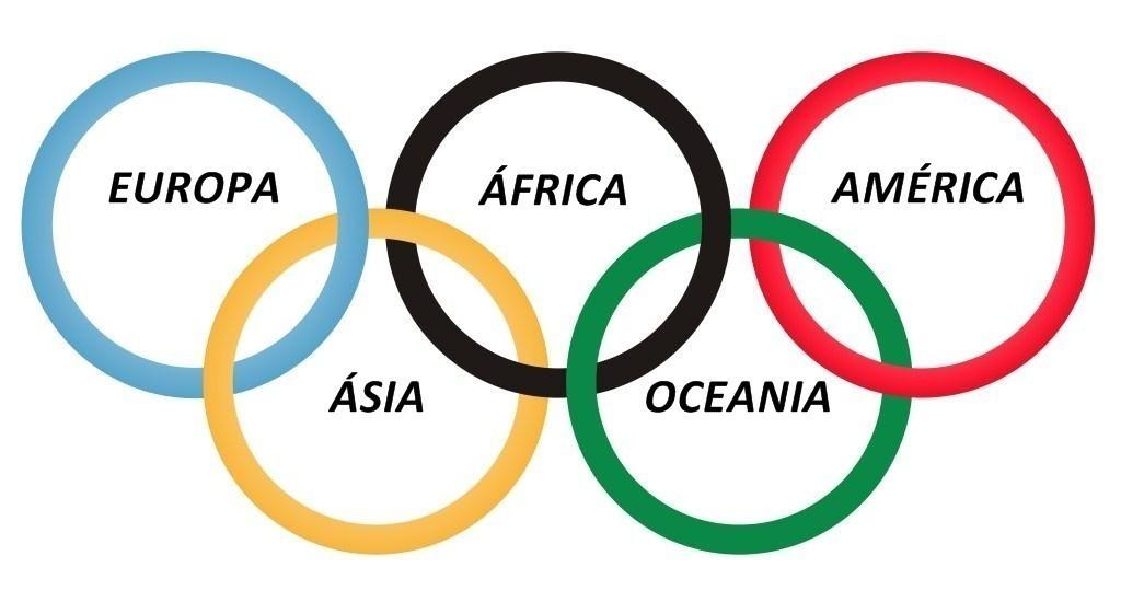 1. Azul – Representa a Europa. 2. Amarelo – Representa a Ásia. 3. Preto – Representa a África. 4. Verde – Representa a Oceania. 5. Vermelho – Representa as Américas.